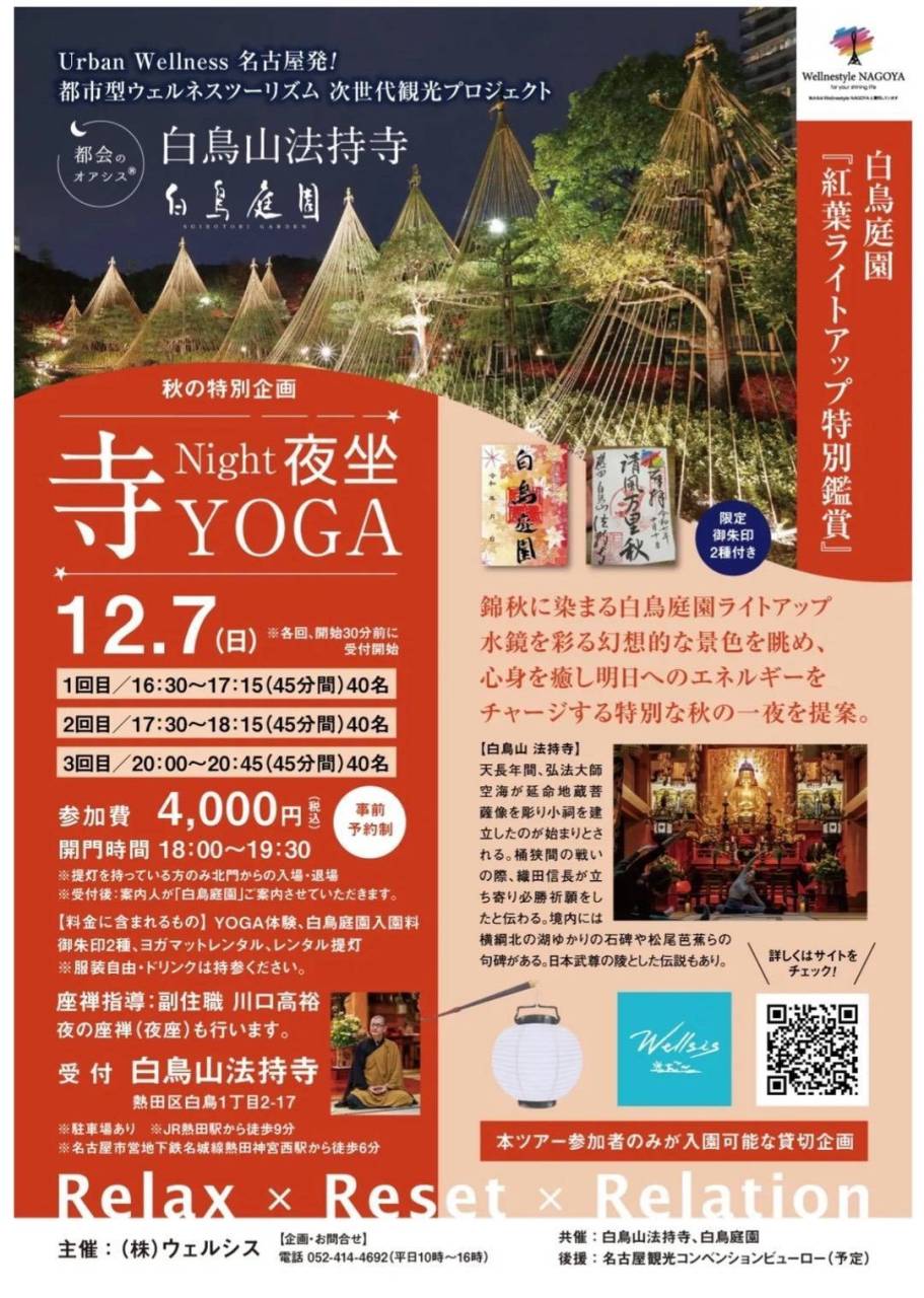 秋の特別企画|都会のオアシス®︎白鳥山法持寺 『Night夜坐 寺YOGA』x白鳥庭園 『紅葉ライトアップ貸切鑑賞』 限定『御朱印』 付き