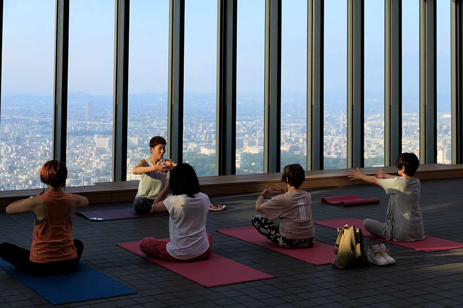 地上約220メートルの屋外展望台“スカイプロムナード”にて、サンセットを眺望しながらの「ヨガ」を開催します。